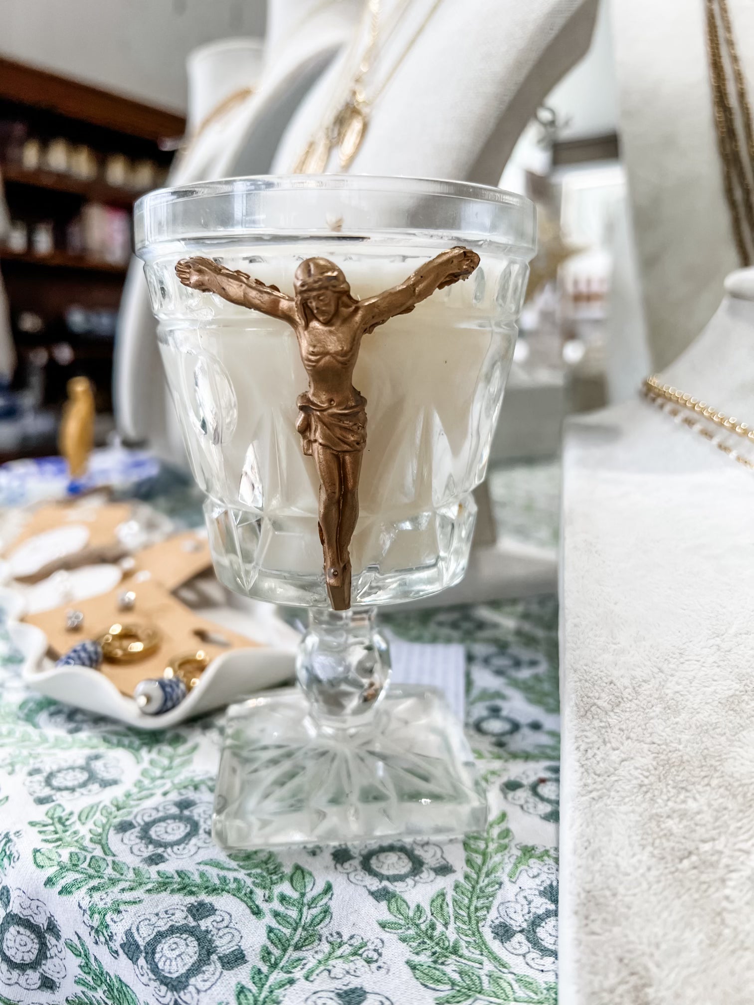 Jesus on crucifix on vintage glass goblet Strong of Pearls